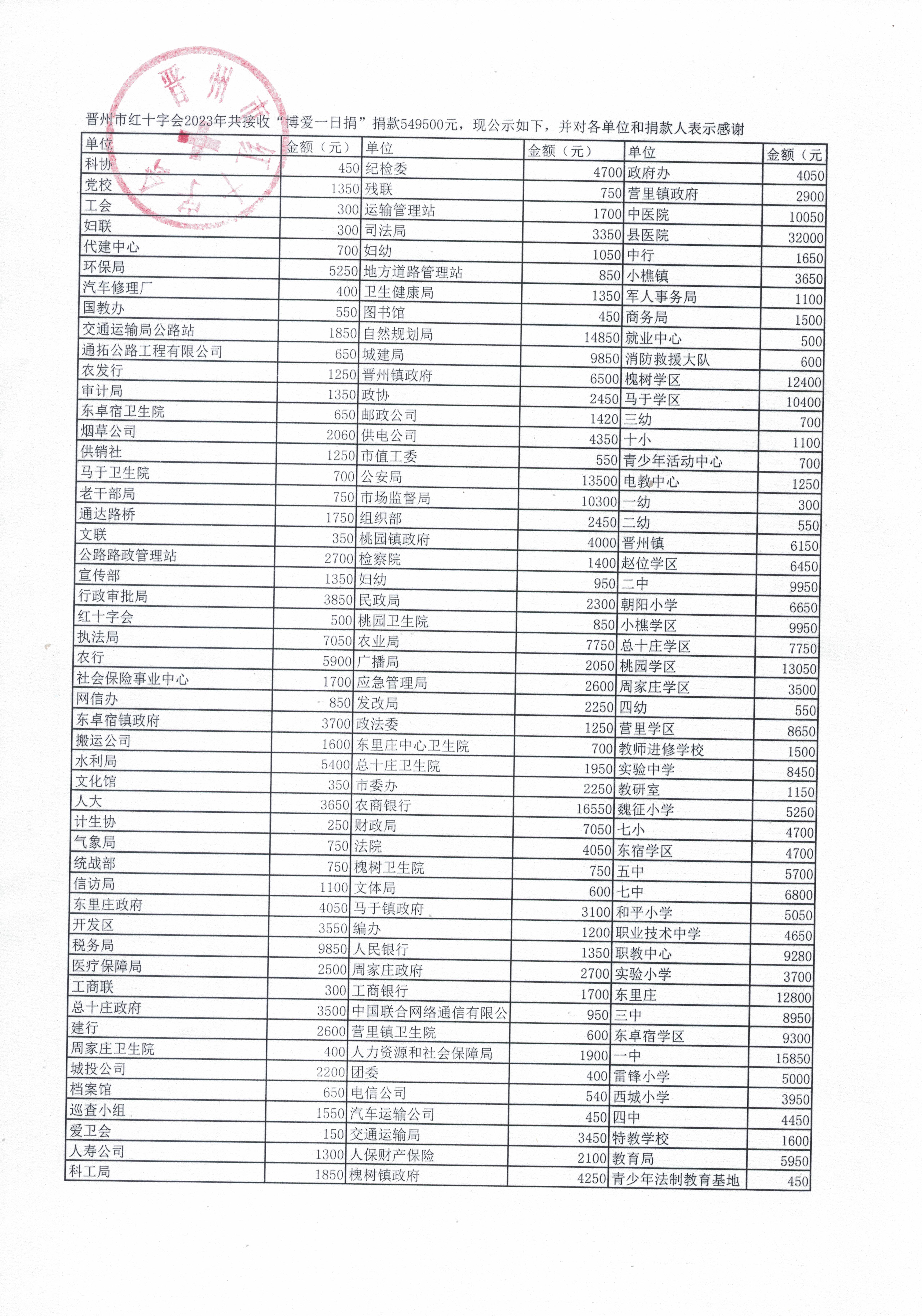 晋州市红十字会2023年“博爱一日捐”捐款明细公示