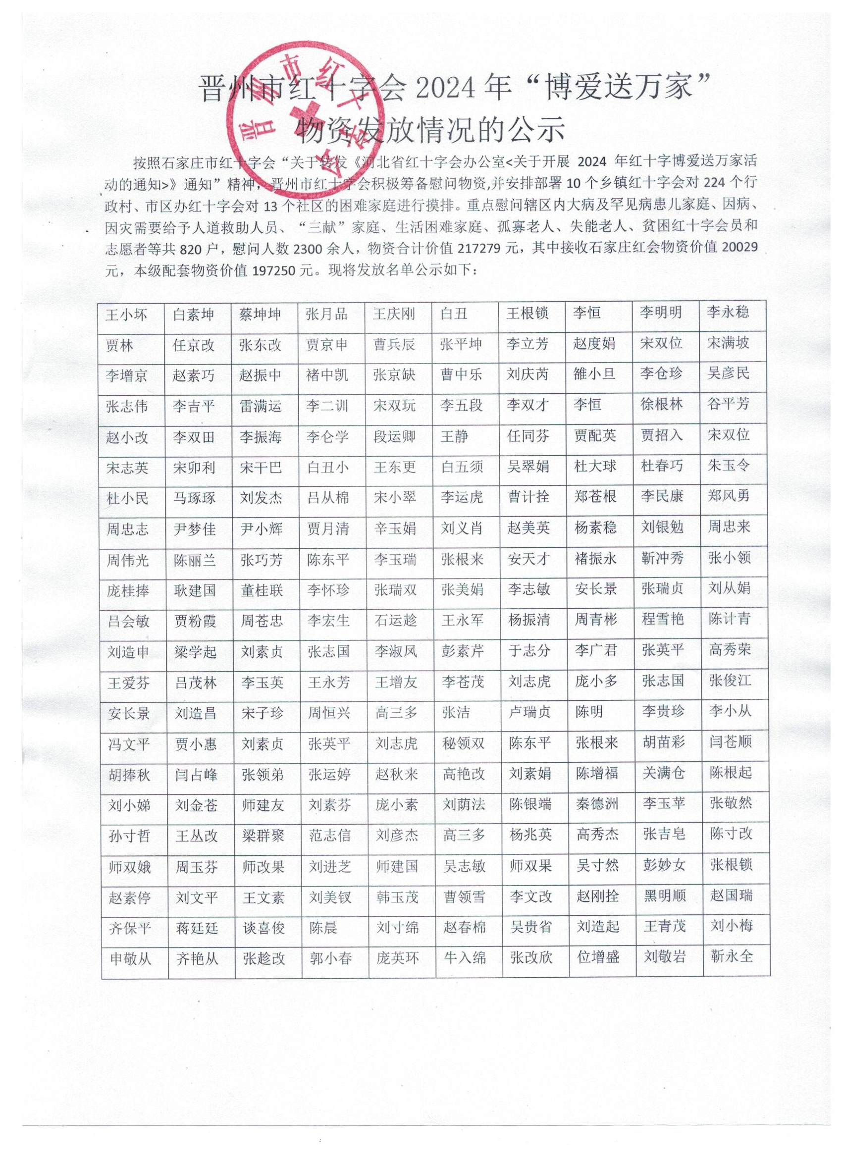 晋州市红十字会2024年“博爱送万家”物资发放情况的公示