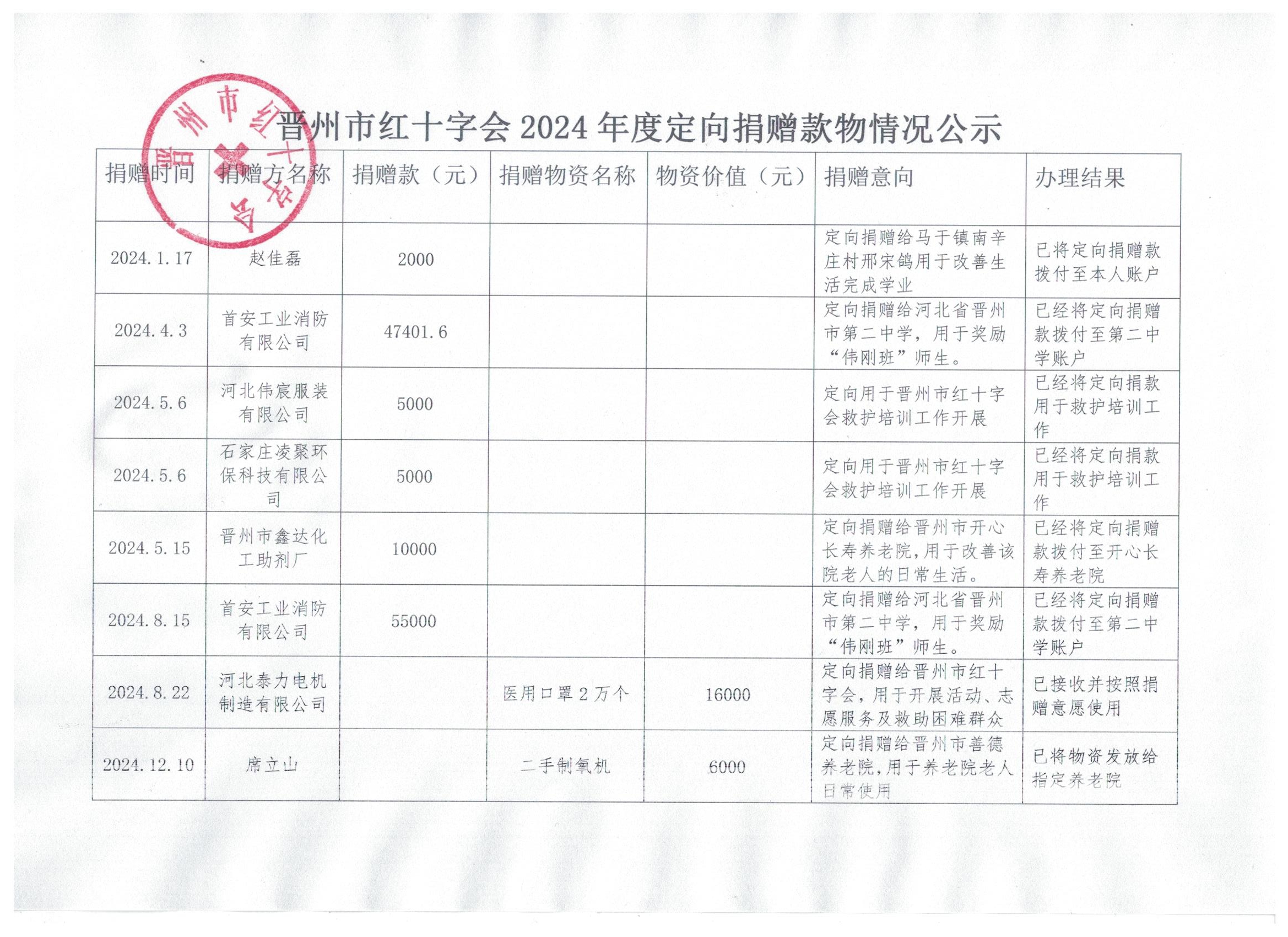 晋州市红十字会2024年度定向捐赠款物情况公示