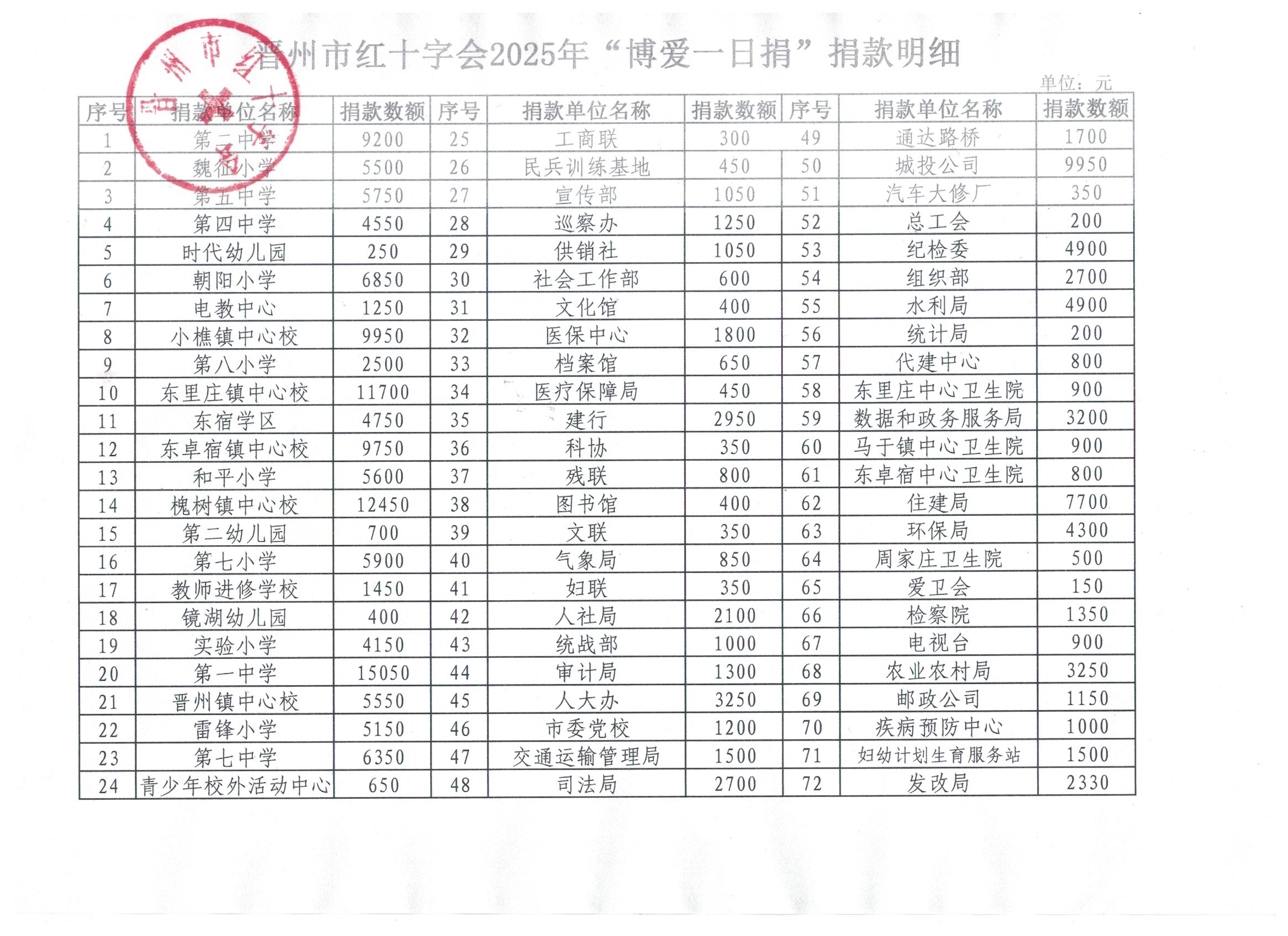 晋州市红十字会2025年“博爱一日捐”捐款明细公示